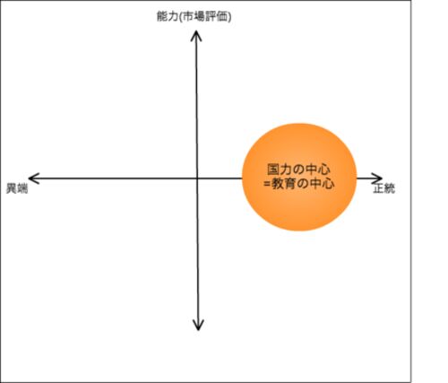 私が、いじめがなくても学校からもう逃げ出した方がいいというエントリで一番言いたかったことは、「人と同じ道を歩む」ことに与えられてきた暗黙のインセンティブを意識しよう、ということです。図にするとこんな感じです。大量生産の製造業が経済の推進力…